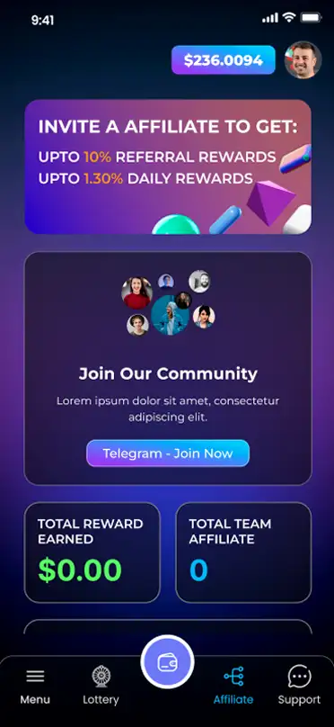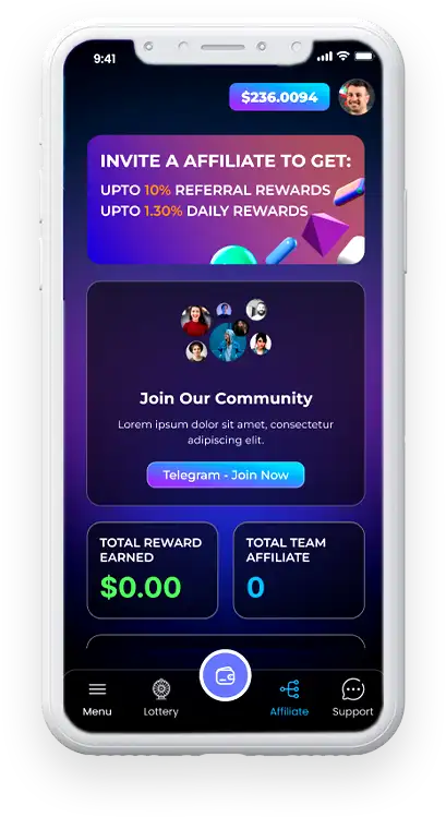 Invite others, build your team, and earn 3%–6% direct income + passive daily rewards.